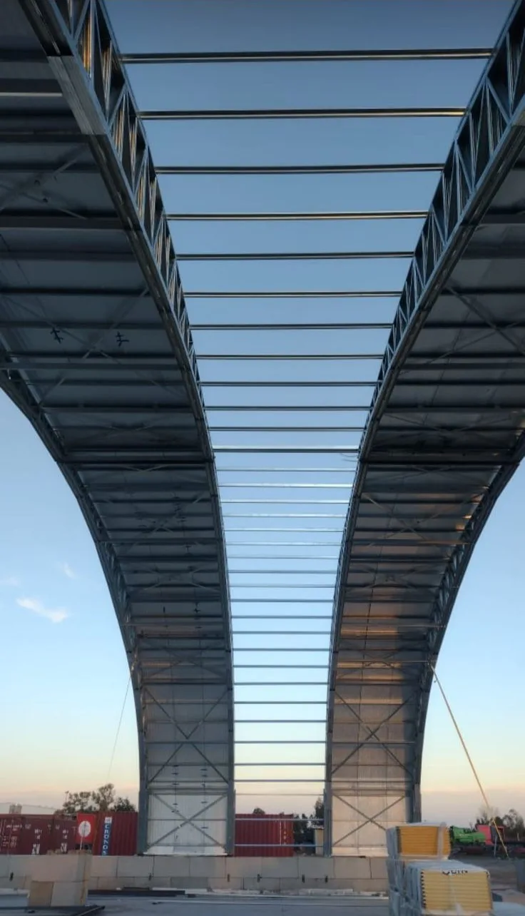 This approach was critical. By eliminating support moments, the structure relied almost entirely on axial capacity, allowing us to achieve such a large clear span with lightweight 90-mm deep light-gauge steel profiles—something that would not have been feasible with a conventional beam-type solution.