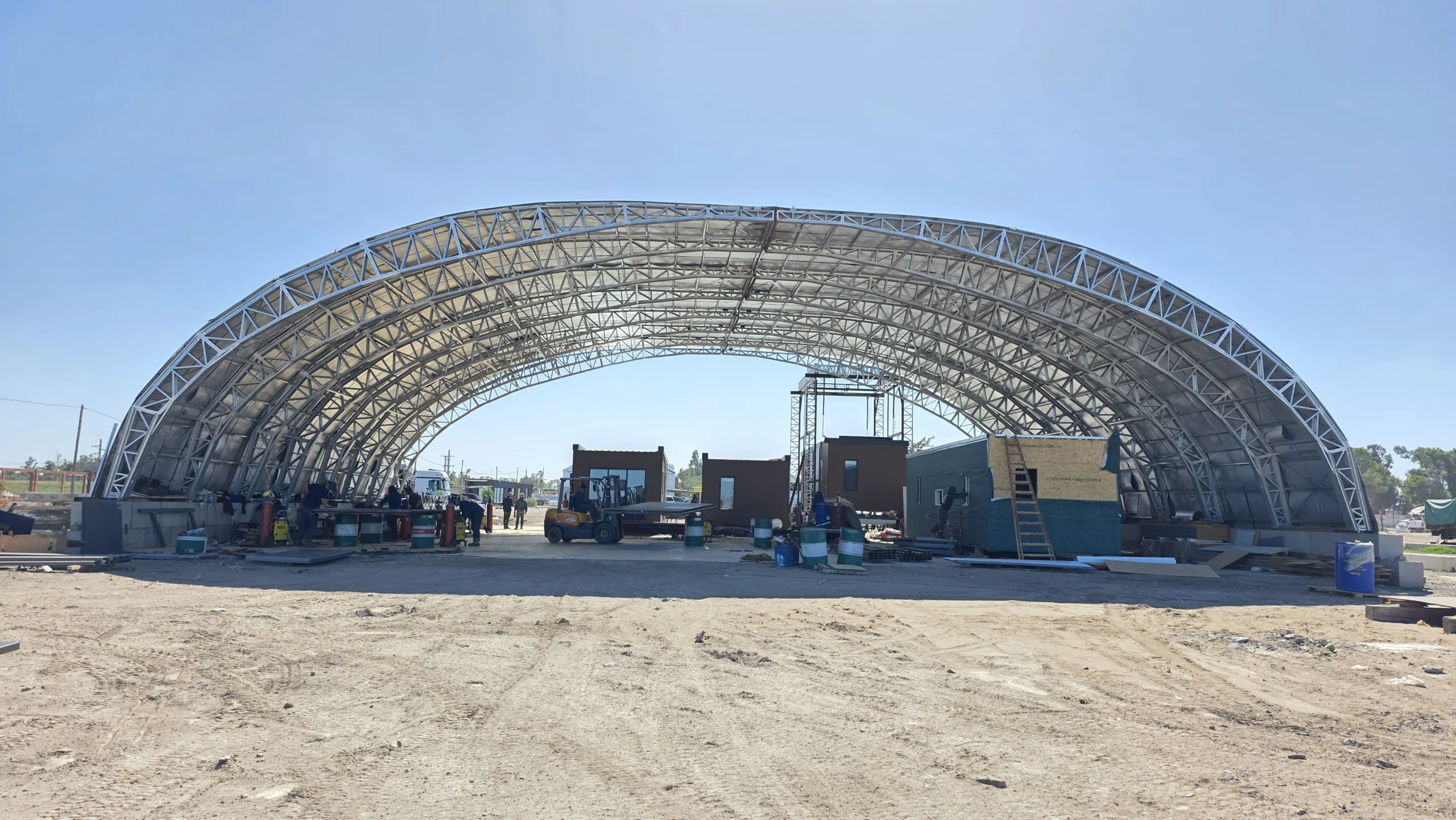 The primary challenge was achieving a 30-meter (98-ft) clear span while at the same time using a light, easily assembled and portable structural system. With the benefit of the unique Scottsdale roll-forming technology, luckily, we were able to do so using only 90-mm (3.5-in.) deep cold-formed steel sections measuring only 1.15 mm (18 Ga., 0.043 mil) in thickness. The span requirement demanded an exceptionally efficient structural strategy and a unique structural system.