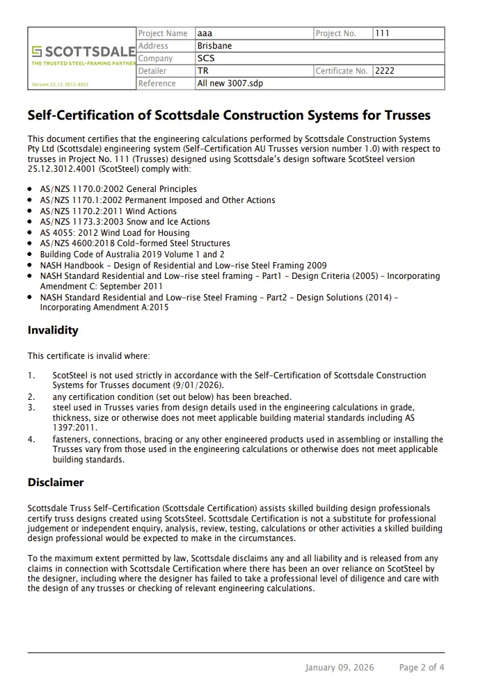 Two individuals within each company must complete the certification process: one acting as the “Designer” and one as the “Checker”. Each individual receives a unique certification number tied to their name. Training covers the full design workflow for light-gauge steel trusses, profile selection, load validation, and automated rule checking. Once training is complete, participants complete a structured assessment reviewed by the Scottsdale team. Successful candidates receive a unique certification number that verifies their ability to produce compliant light-gauge steel truss designs aligned with the Australian Building Codes Board.