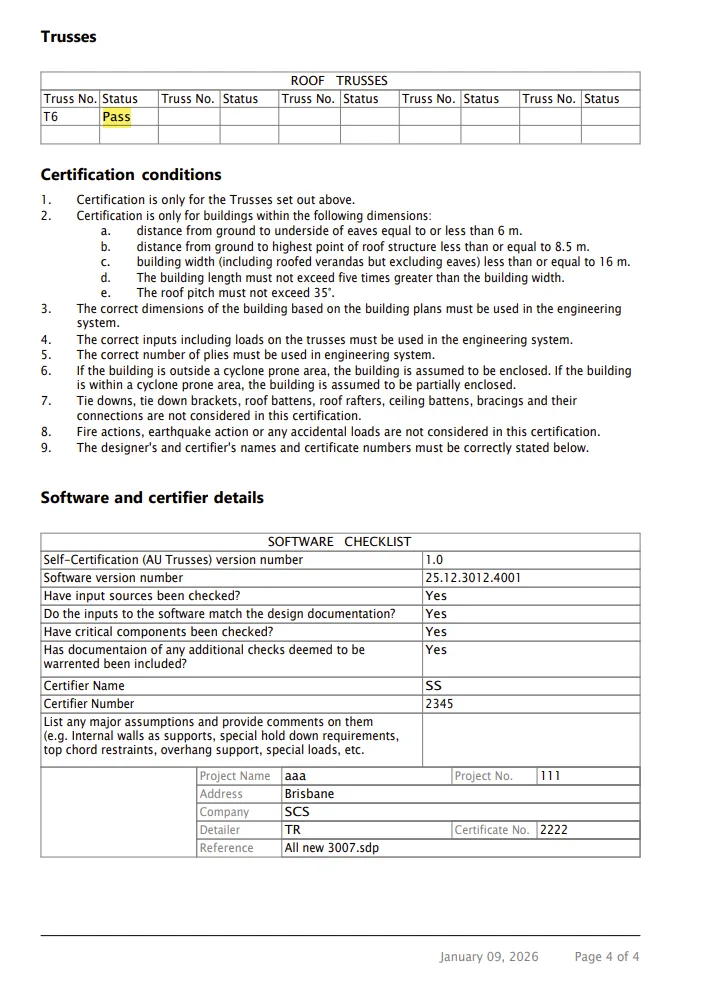 Self-certification allows approved users to certify compliant designs for light-gauge steel trusses without relying on external engineering sign-off, as long as the project meets the prescribed limitations of the Australian Building Codes Board (ABCB) and the ABCB Structural Software Protocol. This applies specifically to CFS roof trusses and floor trusses manufactured through validated design rules and automated checks. The software verifies geometry, loading, and compliance in real time, ensuring every CFS truss design remains within allowable parameters.