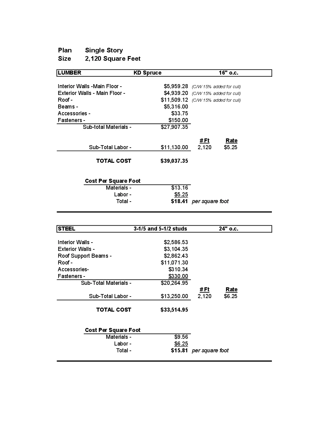 | Lumber (KD Spruce) | 16″ o.c. | $39,037.35 | $18.41 | n/a | n/a |