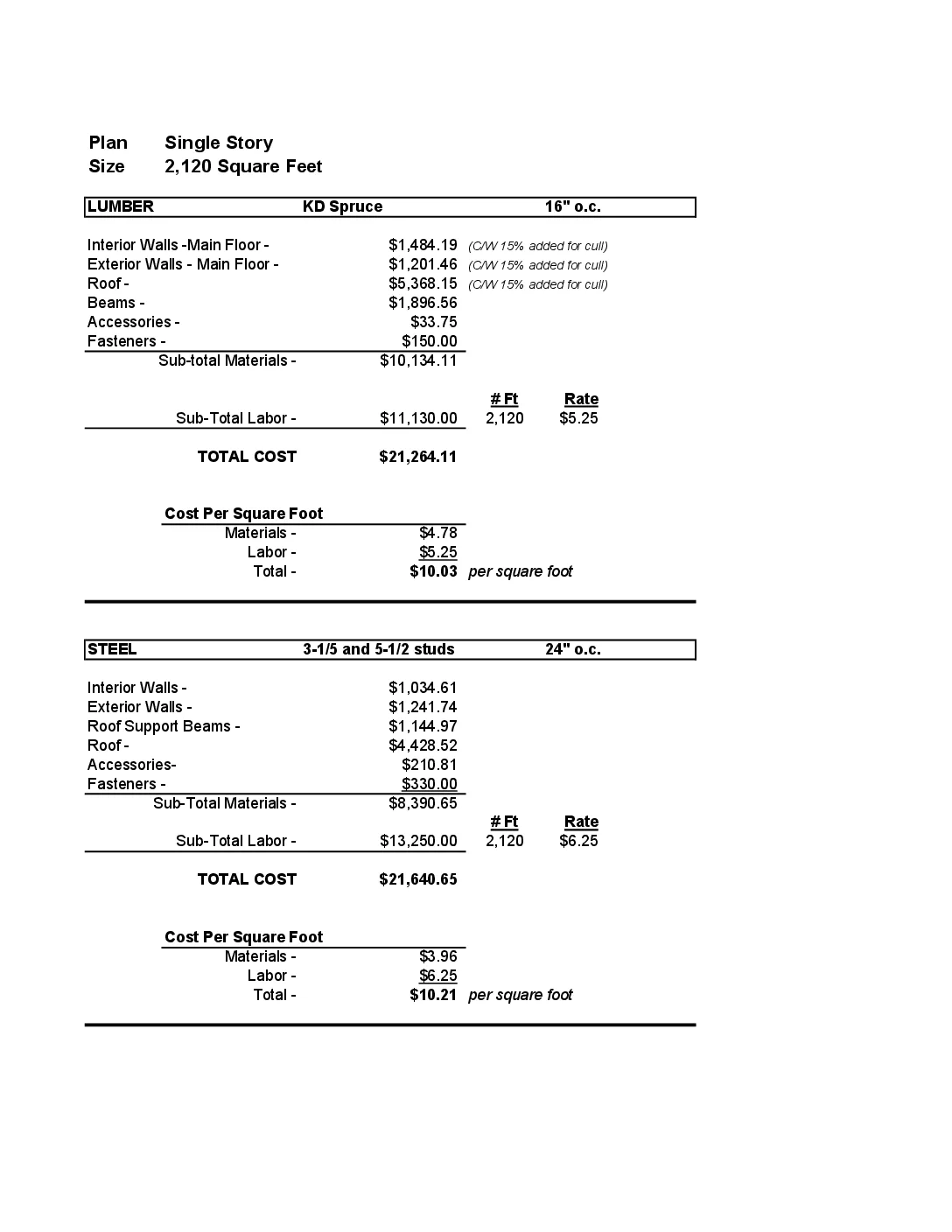 | Lumber (KD Spruce) | 16″ o.c. | $21,264.11 | $10.03 | n/a | n/a |